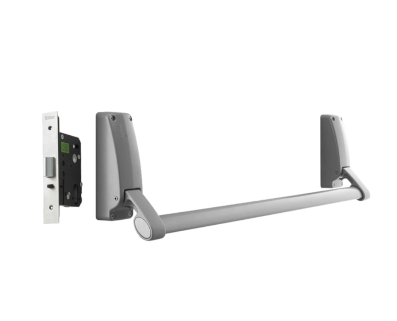 The Briton 379.N is a push bar panic exit device with mortice panic night latch for single and double doors. Featuring an anti-thrust device to prevent forced latch retraction, this exit device is ideal for public areas where additional security is required.