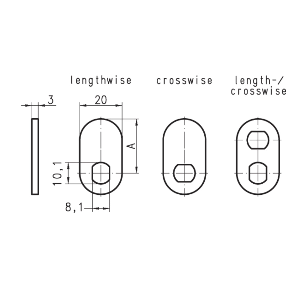 DOM 225 type 1 cam is flat style meaning that it is straight with no crank, it is 20mm wide, 3mm thick and has a radius end. The 30mm version has a single punch out fixing hole (8.1mm x 10.1mm) and the larger versions have 2 x 8.1mm x 10.1mm rectangular Lengthwise and crosswise fixing holes thus allowing them to be mounted in multiple positions.
