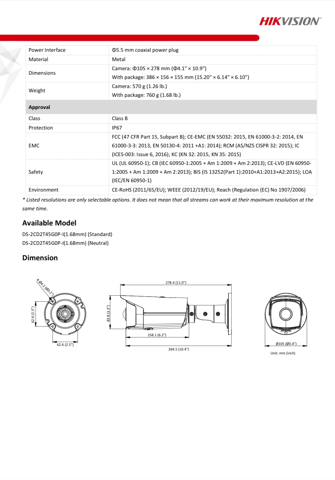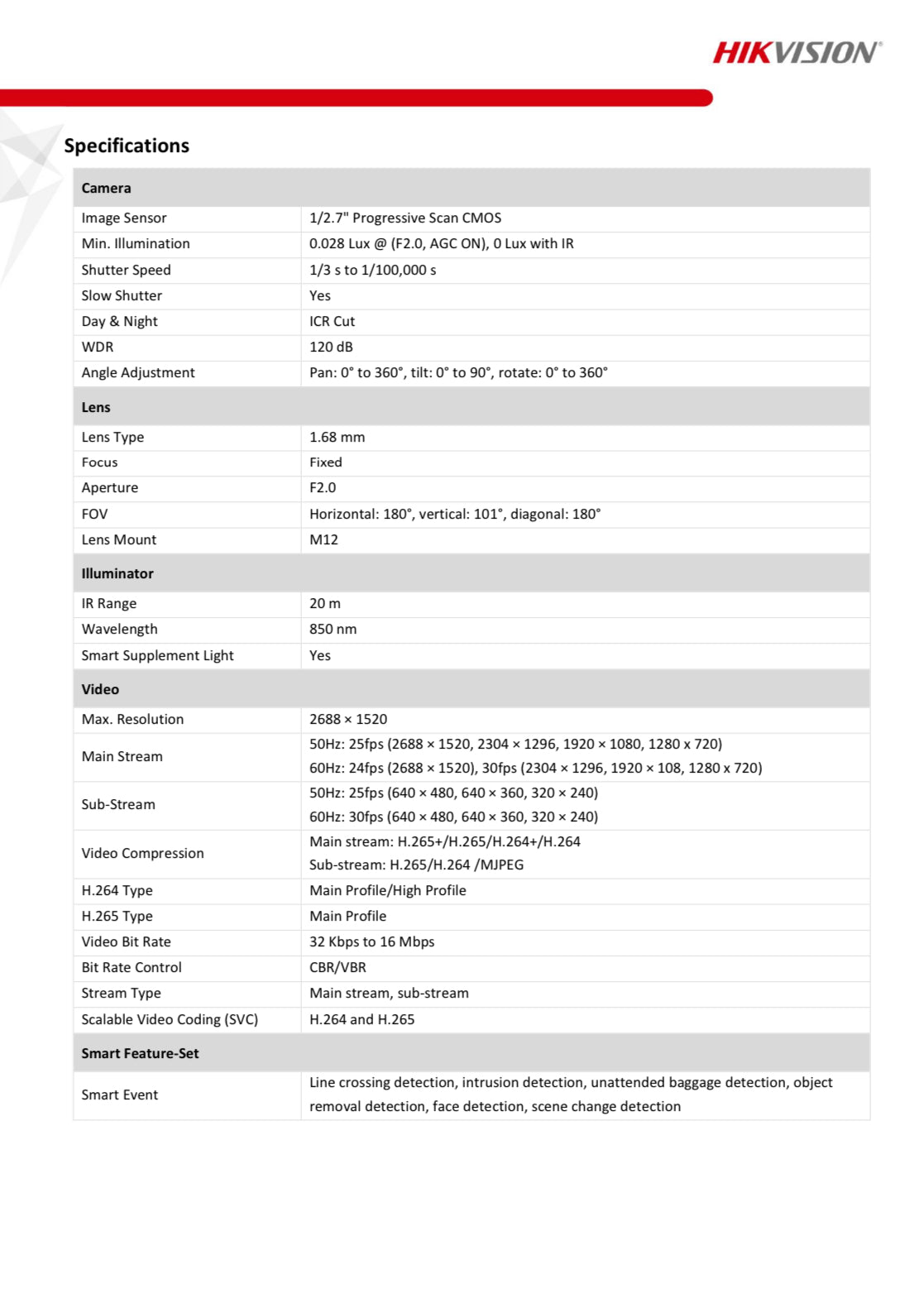 Hikvision 4MP IR Bullet Network 180 FOV Camera, 1.68 mm lens, 12 VDC ± 25%/PoE, 3 year warranty