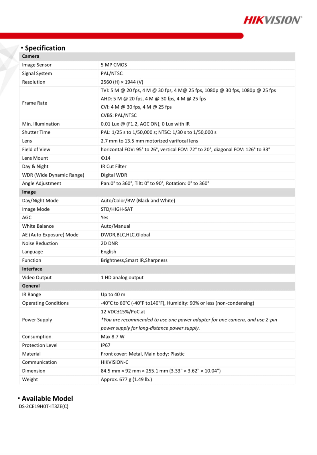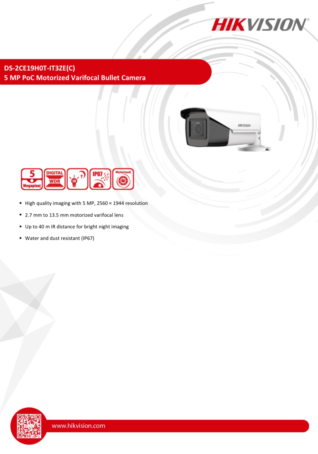 Hikvision Turbo HD 5MP PoC Motorised Vari-focal Bullet, 2.7-13.5mm Motorised lens, up to 40M IR range, 12VDC ±15%/PoC.at, 3 Year Warranty