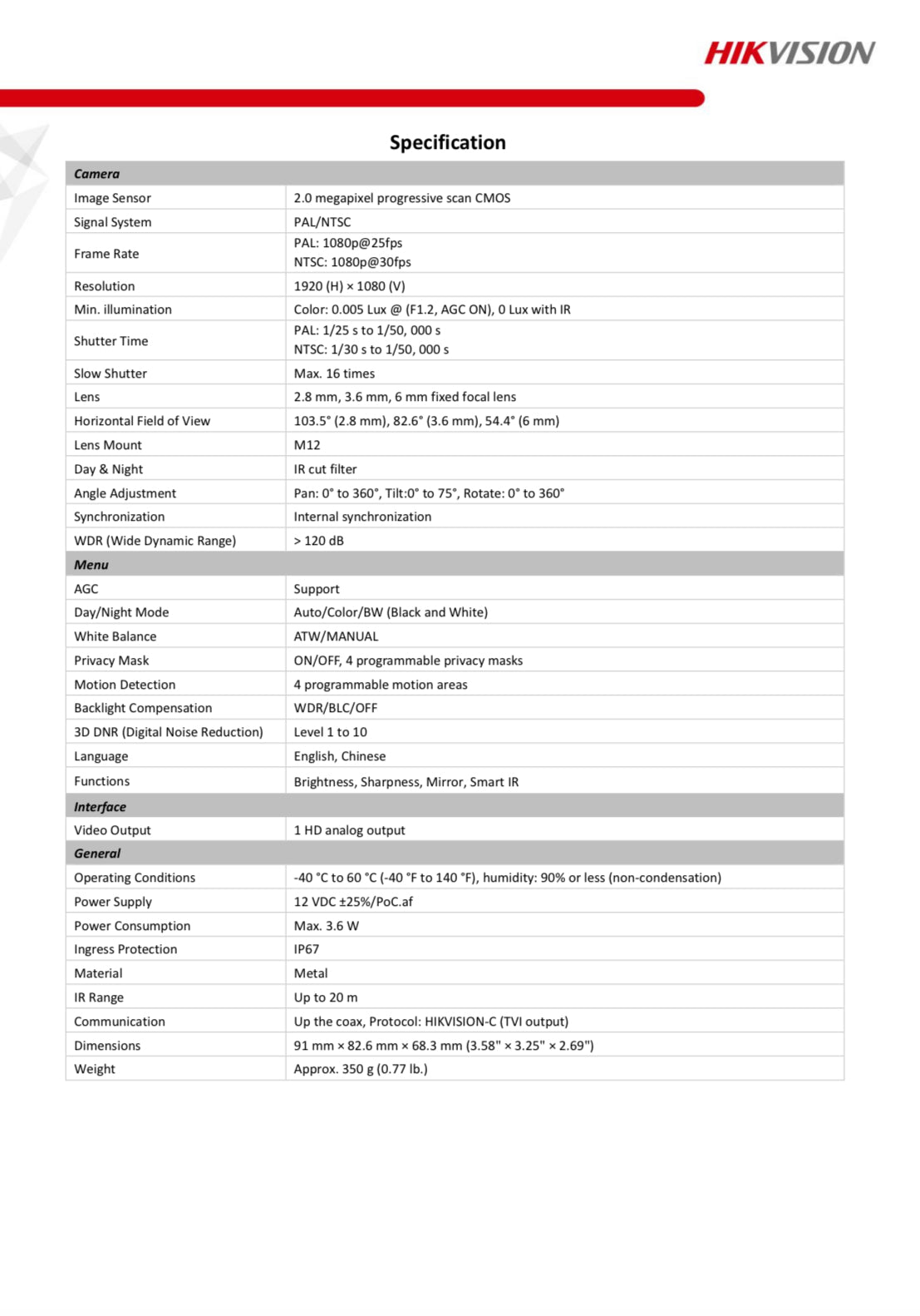HIKVision Turbo HD 2MP Ultra-Low Light PoC Turret Camera, 2MP Progressive Scan CMOS, Colour: 0.005 Lux @ (F1.2, AGC ON), 0 Lux with IR, 2.8mm lens, 1920 x 1080P: 25fps, EXIR 2.0, Smart IR, up to 20m IR Range, OSD Menu (up the coax), 120 dB true WDR, 3D DNR, WDR/BLC/HLC/OFF, IP67, 12 VDC ±25%/PoC.af, 3 year warranty
