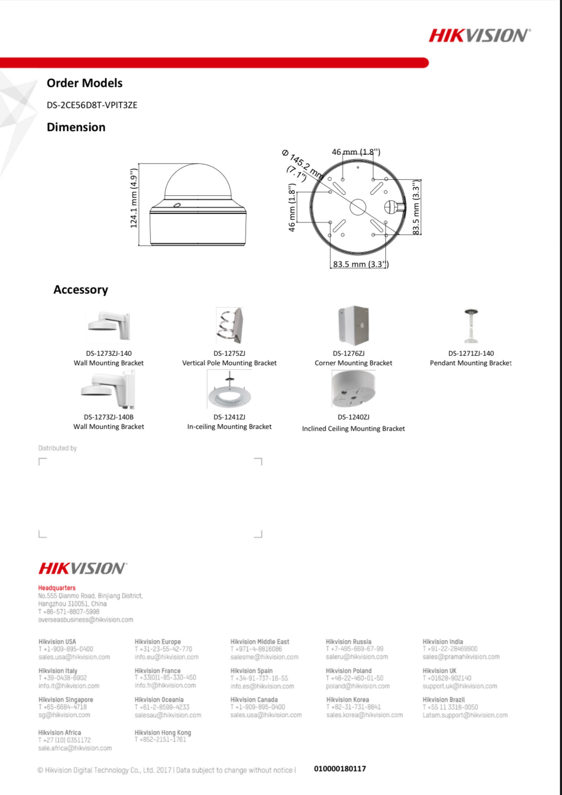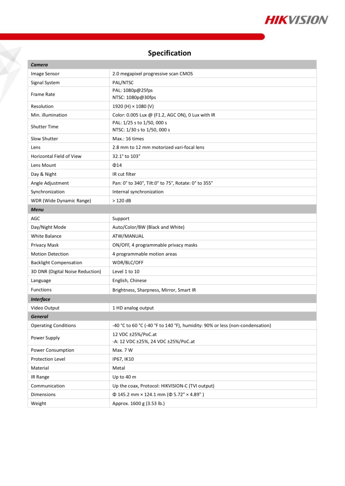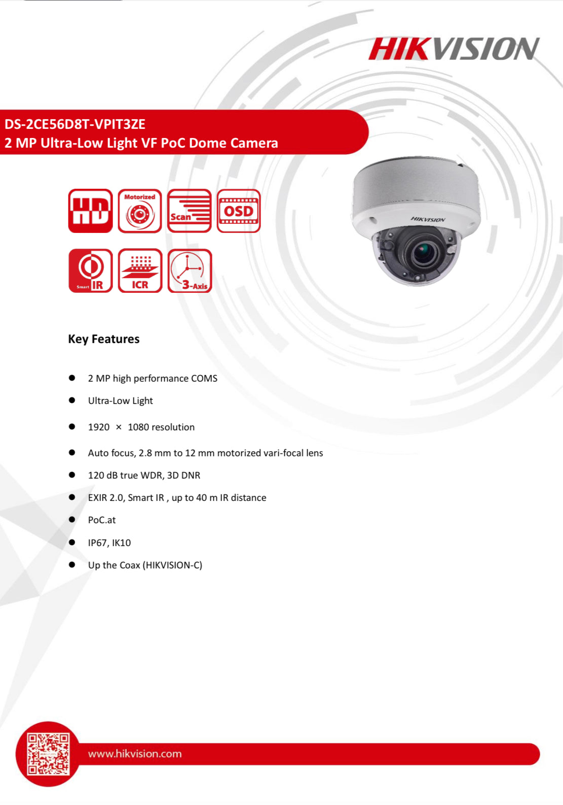 Hikvision Turbo HD 2 MP Ultra Low-Light VF PoC EXIR Dome Camera, 2MP Progressive Scan CMOS, Color: 0.005 Lux @ (F1.8, AGC ON), 0 Lux with IR, 3.6mm lens, 1920 x 1080P: 25fps, EXIR 2.0, Smart IR, up to 40m IR Range, OSD Menu (up the coax), 120 dB true WDR, TDN, DNR, 2.7-13.5mm motorised VF lens, IP67, IK8, 12 VDC±25%/PoC.at, 3 year warranty
