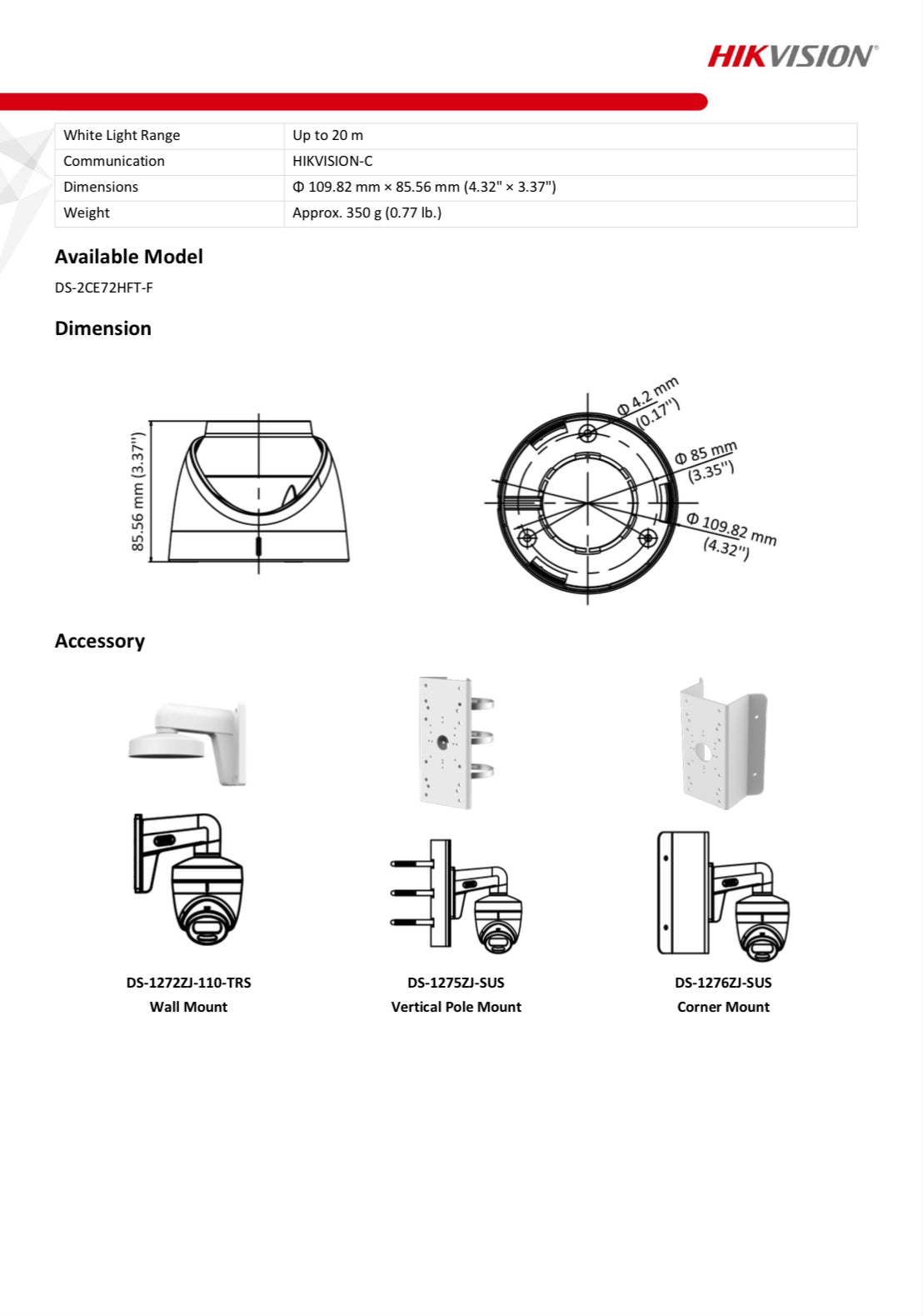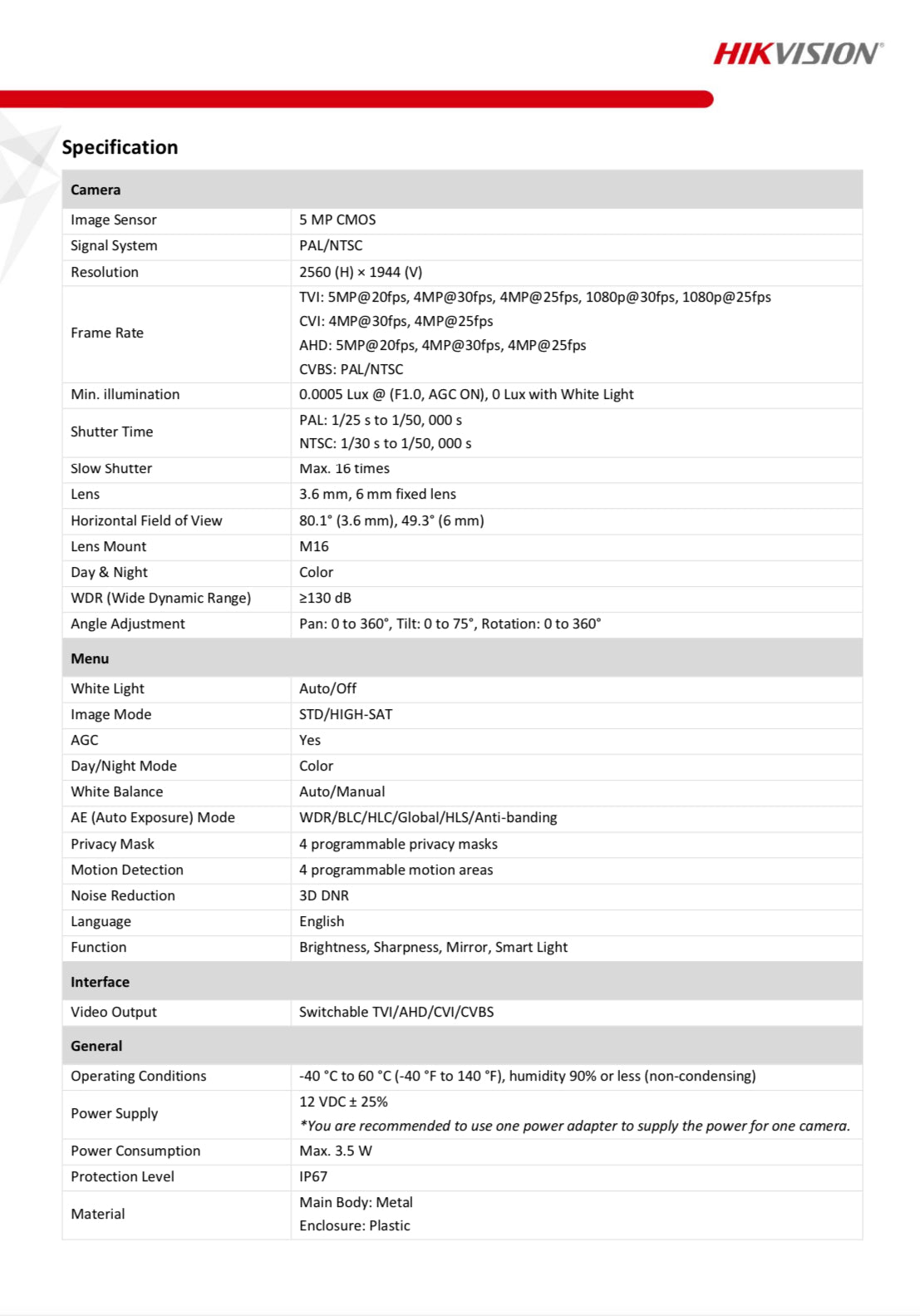 Hikvision 5 MP Full Time Colour Black Camera, ColorVu, Ultra Low-Light, White light, 2.8mm lens, Switchable TVI/ AHD/ CVI/ CVBS, 12 VDC ± 25%, 3 year warranty