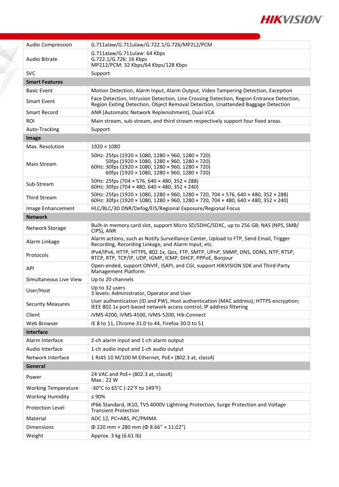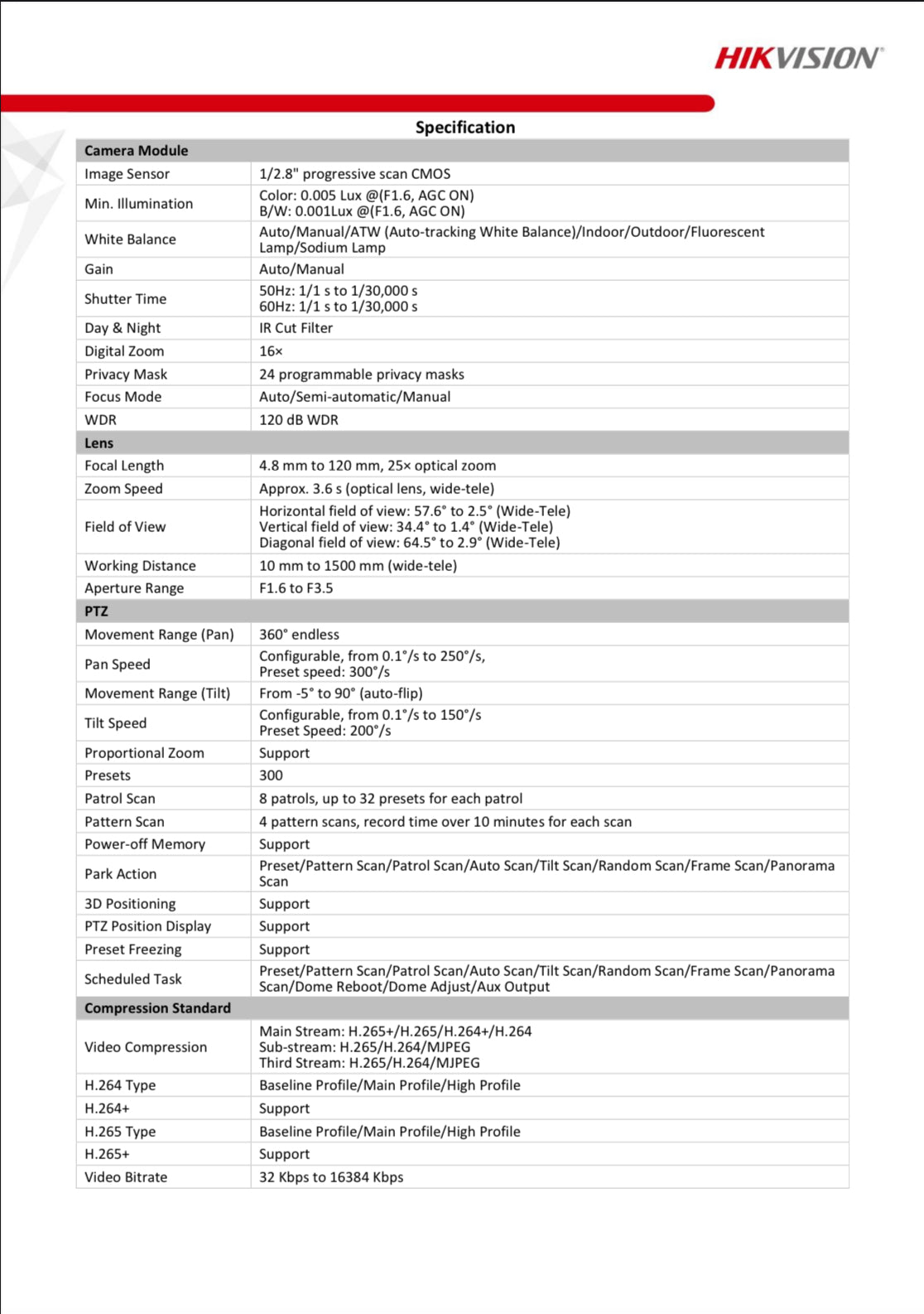 Hikvision 2MP 25× Network Speed Dome, 1/2.8″ progressive scan CMOS, Colour: 0.005 Lux @(F1.6, AGC ON), B/W: 0.001Lux @(F1.6, AGC ON), 1920 × 1080: 50fps, 4.8mm to 120mm, 25× optical zoom/16× digital zoom, SD card slot, up to 128GB, Support H.265+/H.265 video compression, WDR, HLC, BLC, 3D DNR, Defog, EIS, Regional Exposure, Regional Focus, Audio/Alarm I/O, IP66, IK10, 24VAC and PoE+, *PoE injector NOT included, 3 year warranty.