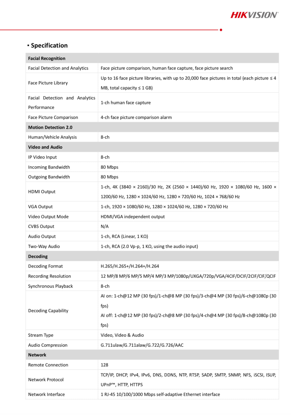 Hikvision 8ch Acusense NVR, up to 12MP resolution recording, Up to 8-ch IP camera inputs, plug & play with 8 PoE interfaces, HDMI/VGA, 48VDC, 3 year warranty