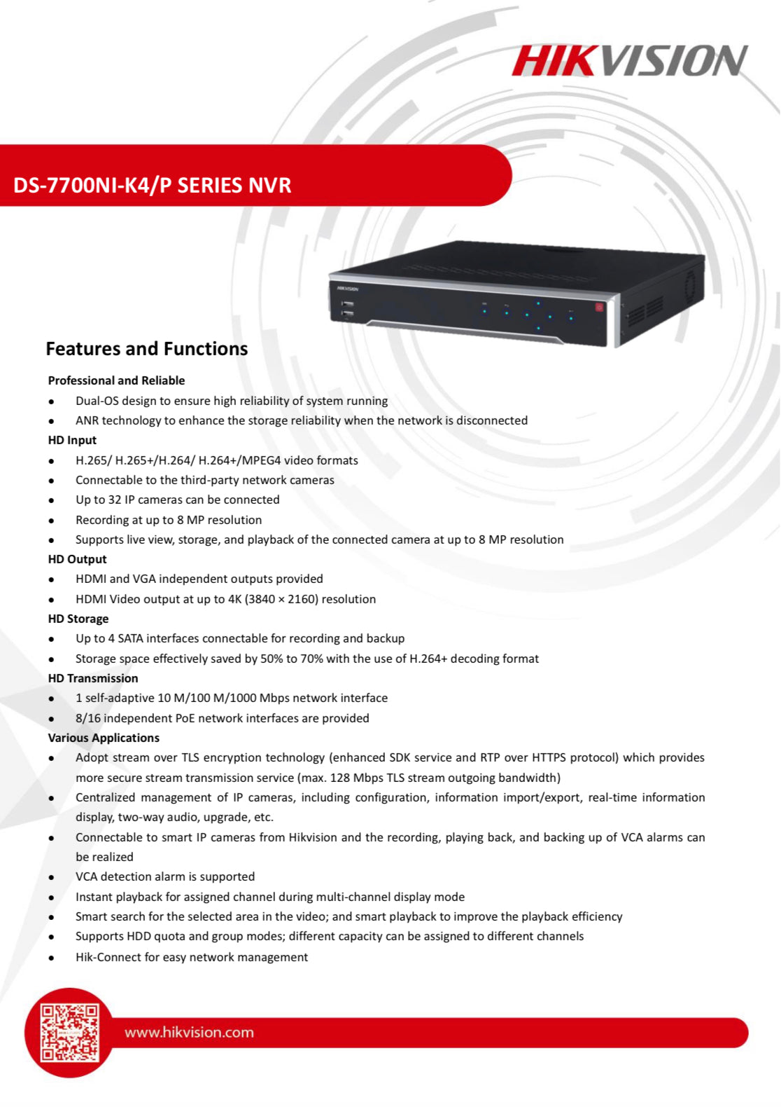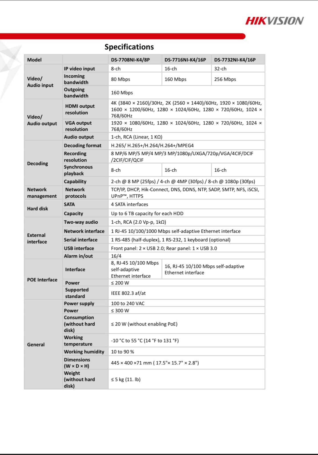 Hikision 32ch NVR, USB Only, 256M Inbound bandwidth, up to 8MP resolution recording, Max 32 IP cameras, 4K HDMI and VGA, 2 × USB 2.0; 1 × USB 3.0, RS-485 and RS-232, 4 x SATA interfaces, 16 port PoE Interfaces, Alarm I/O: 16/4, 1.5U case 19″, 3 year warranty
