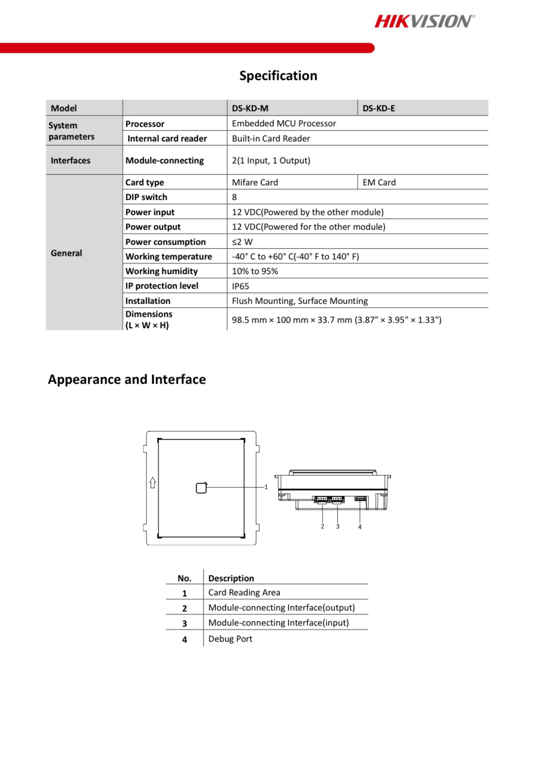 Hikvision Card Reader Module, Supports unlock the door via swiping cards, Backlight compensation, Mifare Card, IP65, 12 VDC(Powered by the other module), 3 year warranty