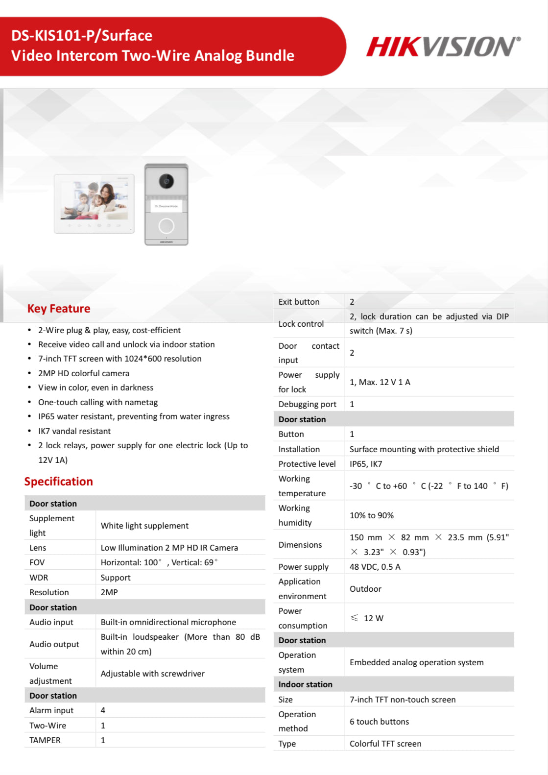 Hikvision Video Intercom Two-Wire Analogue Kit, 2MP Surface Door Station, built-in mic and speaker, 7-inch TFT screen, 2-Wire plug & play, 1, Max. 12 V 1 A, 5 year warranty