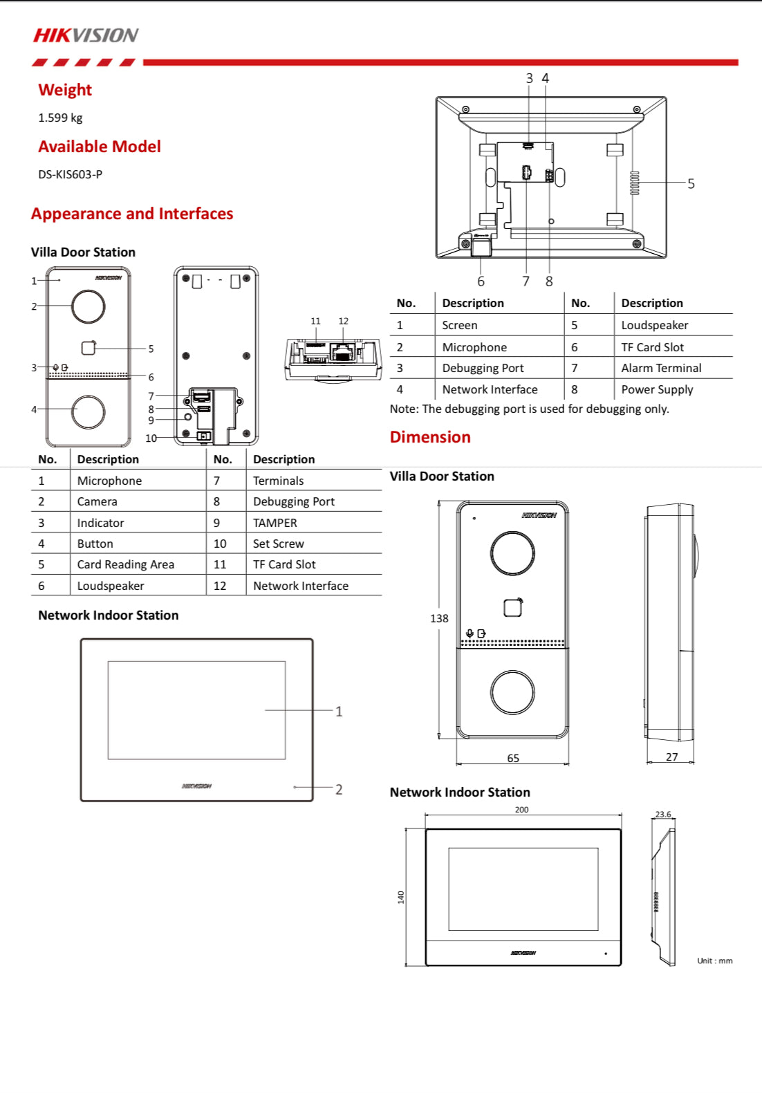 Hikvision Video Intercom Villa Door Station Bundle, Villa Station: 2MP Camera, built in mifare card reader, 1 door call button, IP65. Indoor Station: 7-inch touch screen with resolution 1024 × 600, 3 year warranty