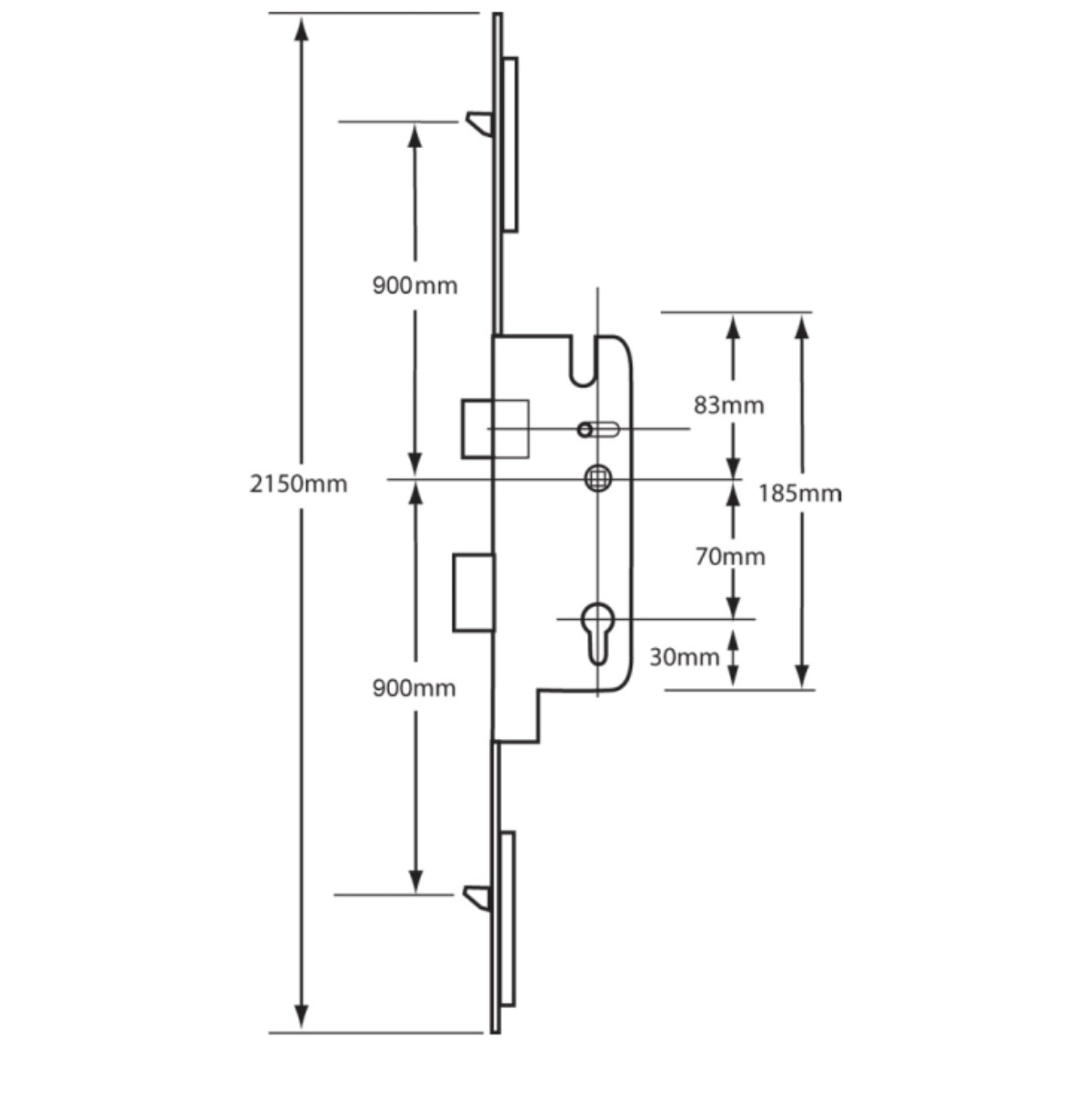 A latch and deadbolt single spindle multipoint lock with 2 small hooks and 70mm centres.