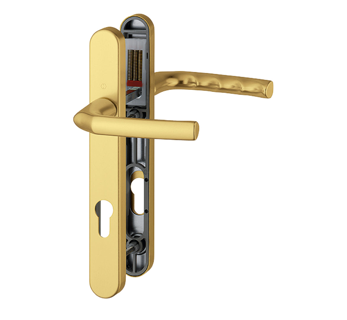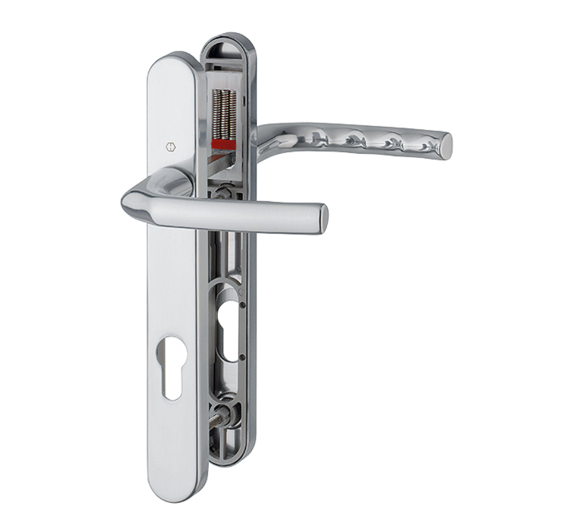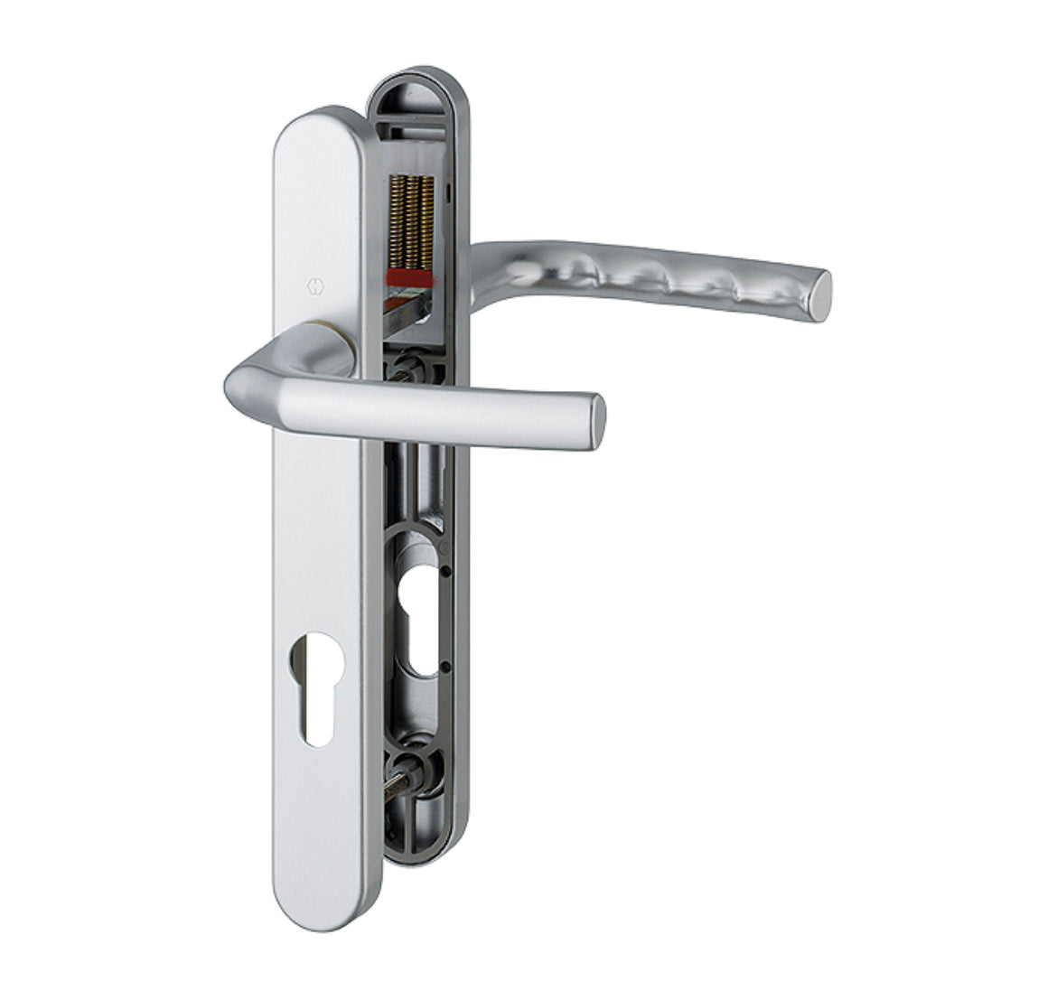 The Hoppe Birmingham 1117/3811N is an aluminium handle on narrow backplate set for profile doors which is tested to DIN EN 1906: 26-0040A (Category of use grade 2) with 122mm screw fixing centers. It has very high corrosion resistance (EN 1670, grade 4), maintenance-free slide bearings, a stainless steel base with nylon fixing lugs, M5 bolt through fixings and comes complete with fixings, cover caps for screw heads, one spring cassette and spindle.
