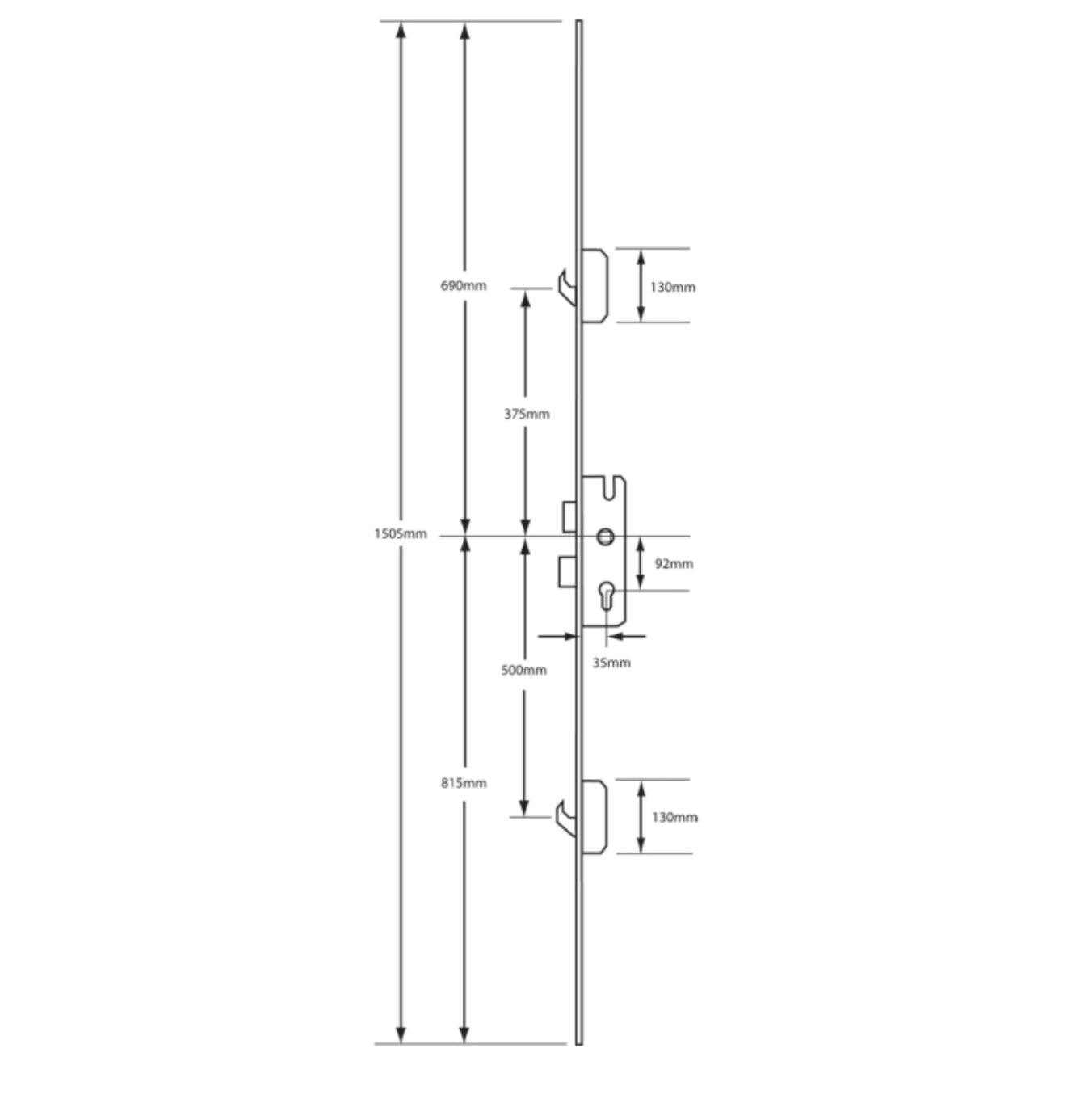 This KFV 7970 is a short version single spindle lever operated latch and deadbolt multipoint with 2 hooks. The faceplate is 16mm and the gearbox has 92mm centres.