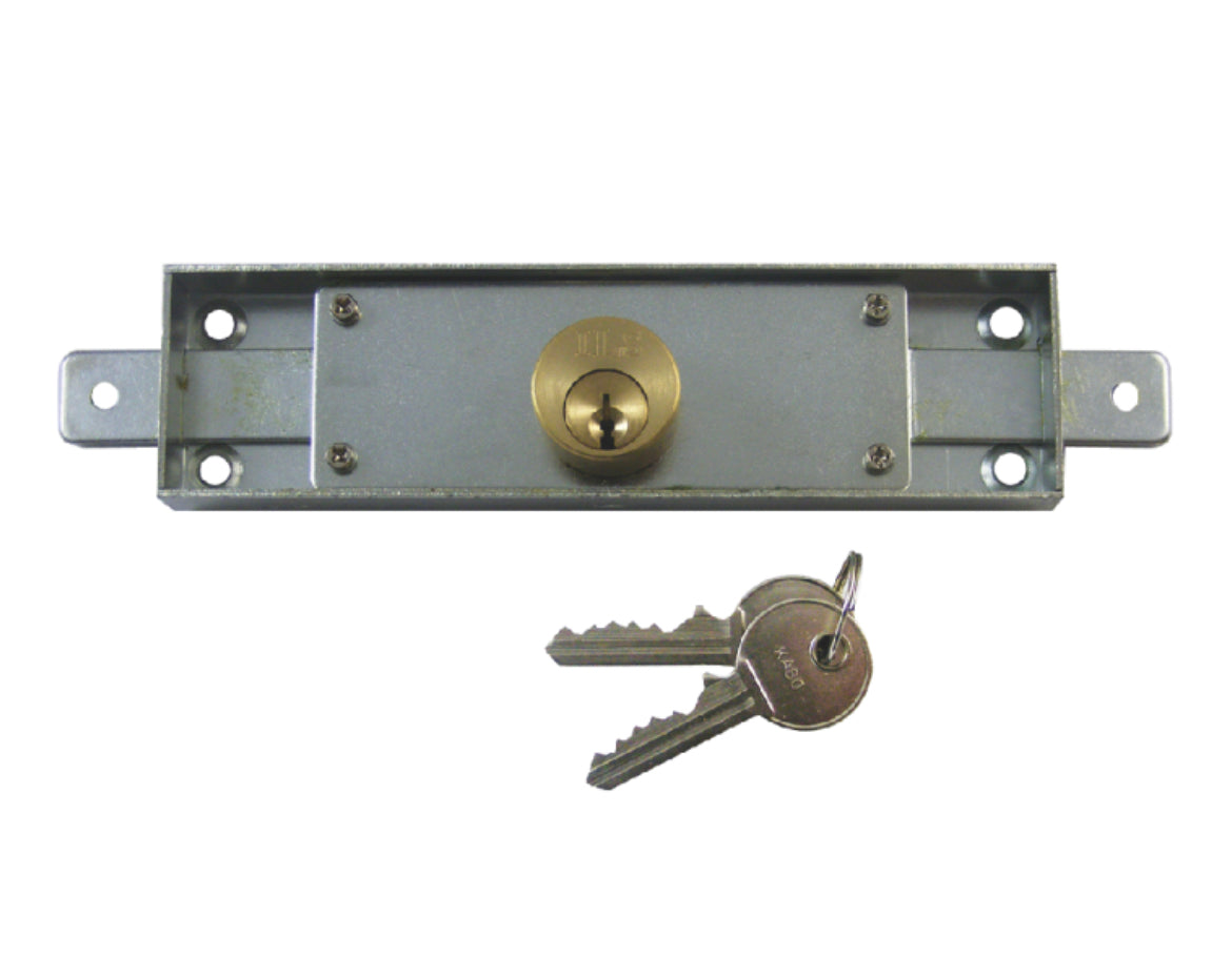 The Tessi 6430 narrow roller shutter lock is usually installed in the centre of the door. Both side arms extend when operated, these are linked to the shutter's locking bars, these lock the shutter into both sides of the frame for increased security. The lock case is installed on the inside of the door with the barrel protruding through the door to allow key access.